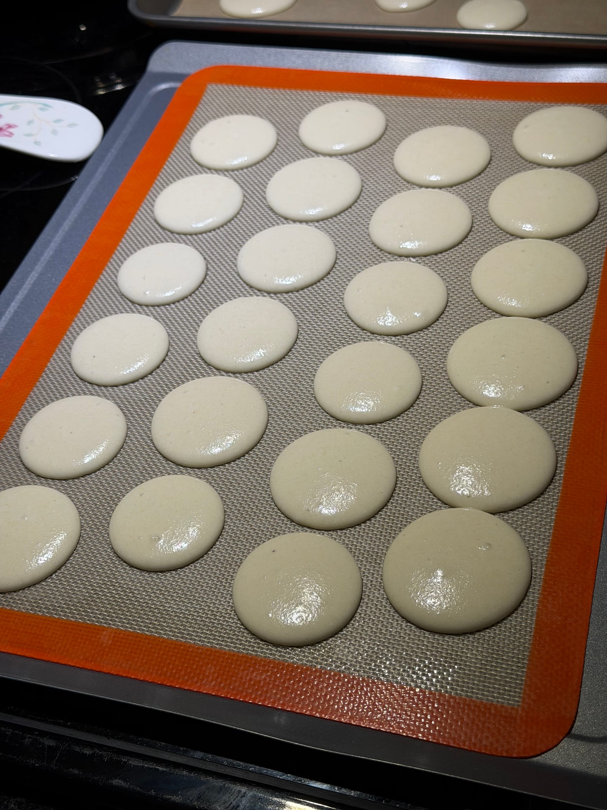 Piping these guys was SO HARD. You can't really see but the mat these are on even have nice little circles to guide everything... nope... still ended up with a bunch that were touching. I've had this happen with cookies in the past and it's usually not a problem. Well, with macarons, those cookies are basically ruined. I mean I still ate every single one of those ruined ones but I wasn't able to make the actual final product you all have grown to love.